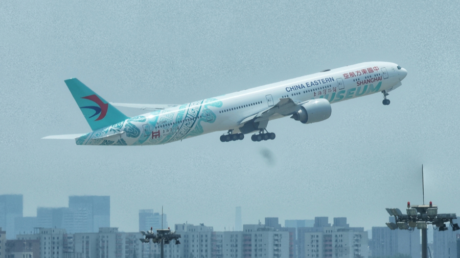 以中国古代艺术为主题的宽体彩绘飞机——“上博号”正式启航。本报记者 赖鑫琳 摄