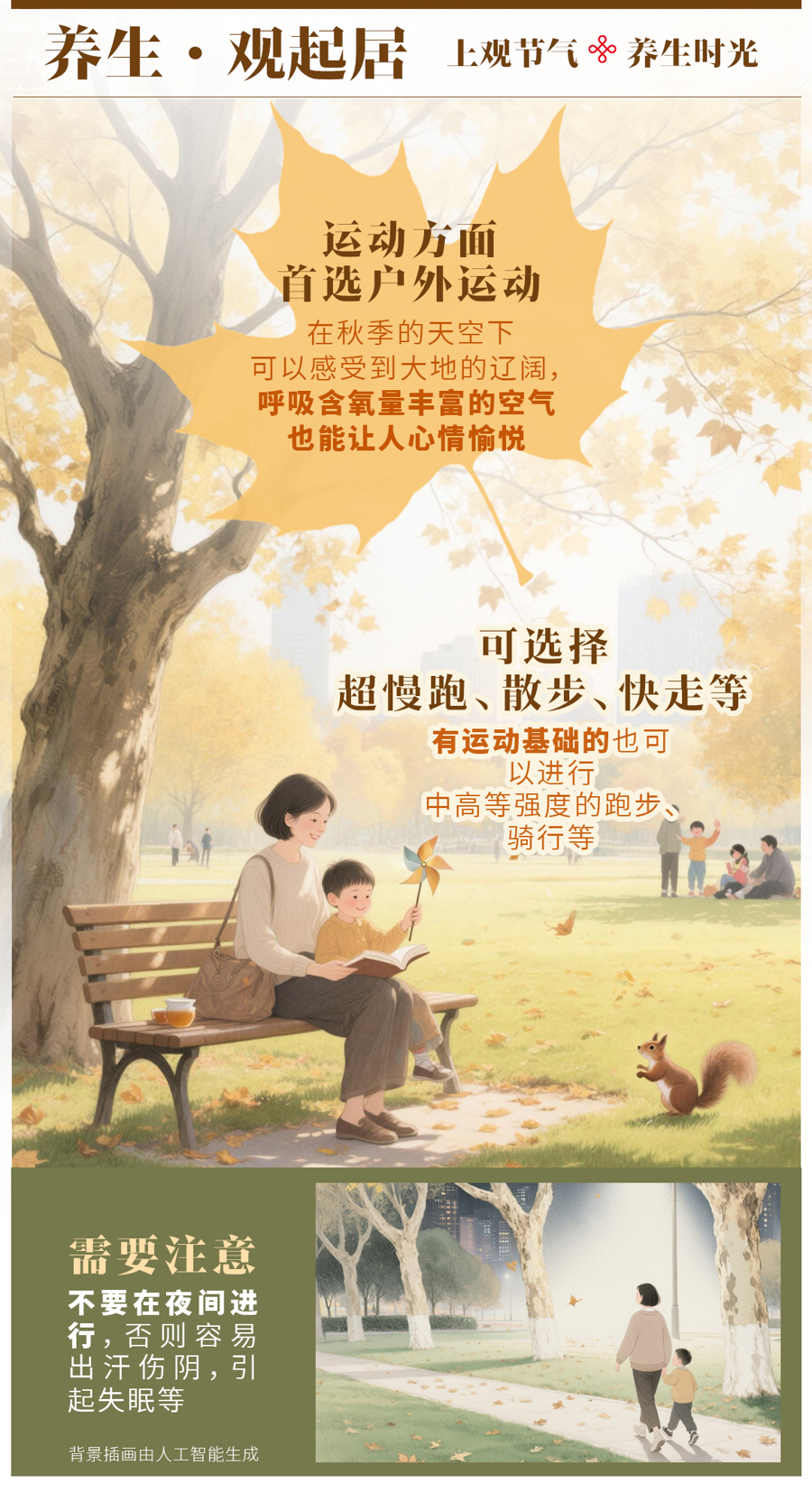 运动方面首选户外运动,在秋季的天空下可以感受到大地的辽阔,呼吸含氧量丰富的空气也能让人心情愉悦。可选择超慢跑、散步、快走等,有运动基础的也可以进行中高等强度的跑步、骑行等,但是需要注意不要在夜间进行,否则容易出汗伤阴,引起失眠等。