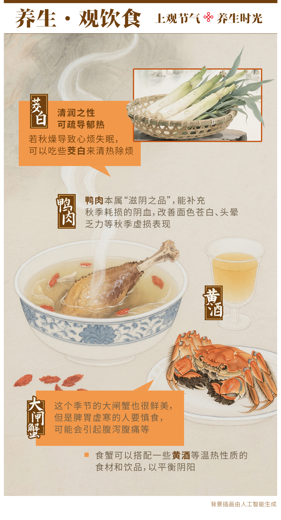 针对秋季“燥扰心神”导致的心烦、失眠、口苦,也可以吃一些茭白,清热除烦,茭白的清润之性可疏导郁热。肉类可以选择鸭子来滋阴补虚:鸭肉本属“滋阴之品”,能补充秋季耗损的阴血,改善面色苍白、头晕乏力等秋季虚损表现。这个季节的大闸蟹也很鲜美,但是脾胃虚寒的人要慎食,可能会引起腹泻腹痛等。食蟹可以搭配一些黄酒等温热性质的食材和饮品,以平衡阴阳。