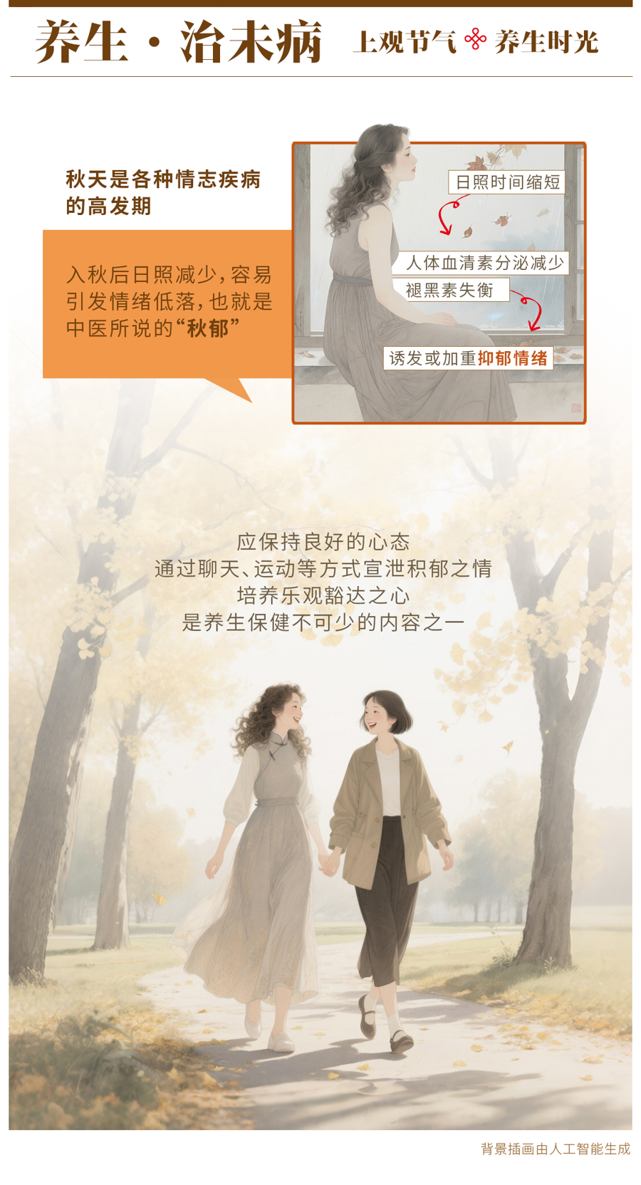 秋天是各种情志疾病的高发期,霜降后日照时间缩短,人体血清素分泌减少,褪黑素失衡,易诱发或加重抑郁情绪,中医称为“秋郁”,属“情志病”范畴——秋季“肺金当令”,肺主“悲忧”,阳气收敛若不畅,易致情志郁结。应保持良好的心态,通过聊天、运动等方式宣泄积郁之情,培养乐观豁达之心,是养生保健不可少的内容之一。