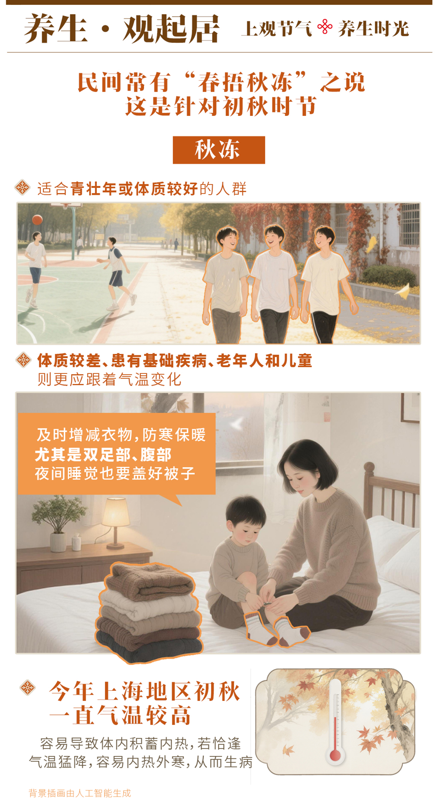 民间常有“春捂秋冻”之说,这是针对初秋时节,过早的增加衣物确实容易出汗,受风后容易感冒,“秋冻”适合青壮年或体质较好的人群,而对于体质较差、患有基础疾病、老年人和儿童则更应跟着气温变化,及时增减衣物,防寒保暖,尤其是双足部、腹部,夜间睡觉也要盖好被子。