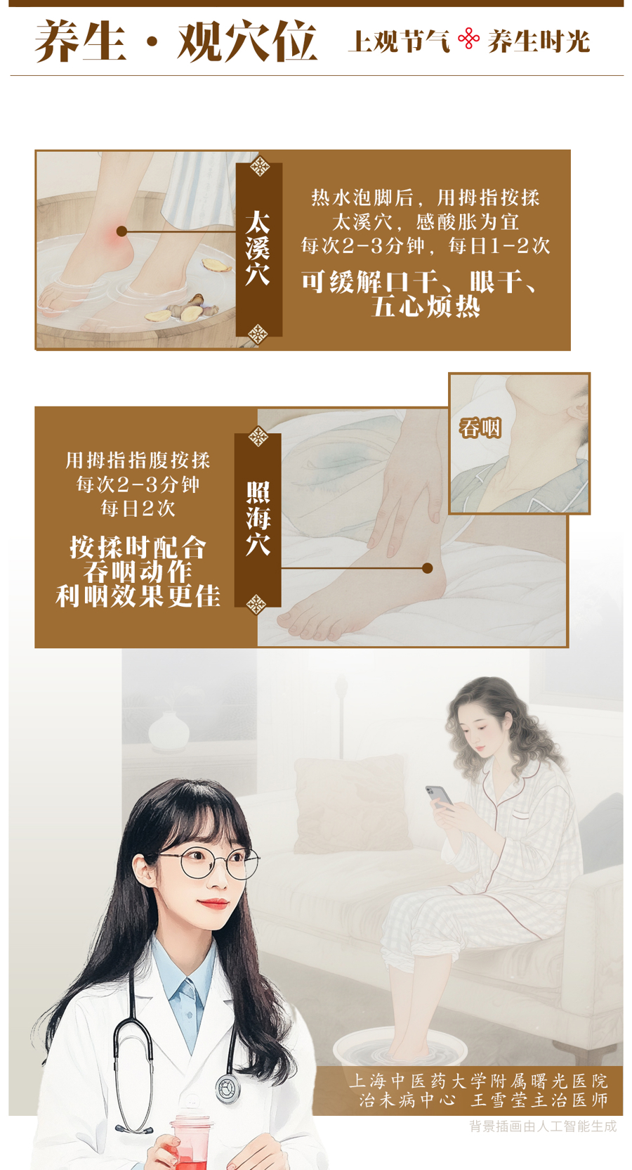 可先用热水泡脚半小时左右,用拇指按揉本穴,以感觉酸胀为度。每次按揉2-3分钟,每天1-2次。可缓解口燥咽干、眼目干涩、五心烦热等症状。