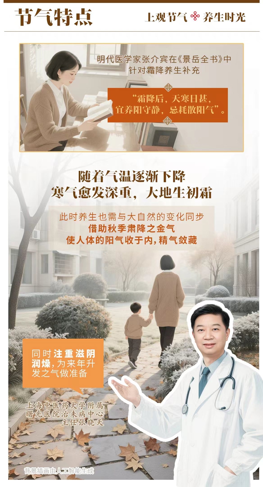霜降是秋季的最后一个节气,意味着冬季的起始。明代医学家张介宾在《景岳全书》中,针对霜降养生补充:“霜降后,天寒日甚,宜养阳守静,忌耗散阳气”。