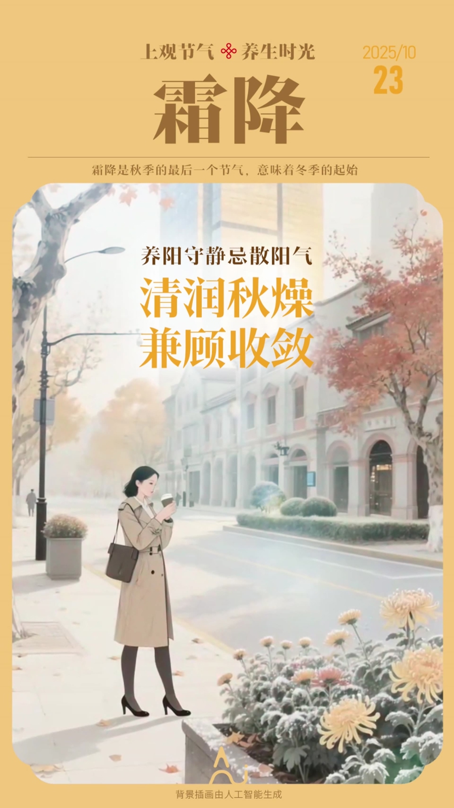 随着气温逐渐下降,寒气愈发深重,大地生初霜,此时养生也需与大自然的变化同步,借助秋季肃降之金气,使人体的阳气收于内,精气敛藏,同时注重滋阴润燥,为来年生发之气做准备。