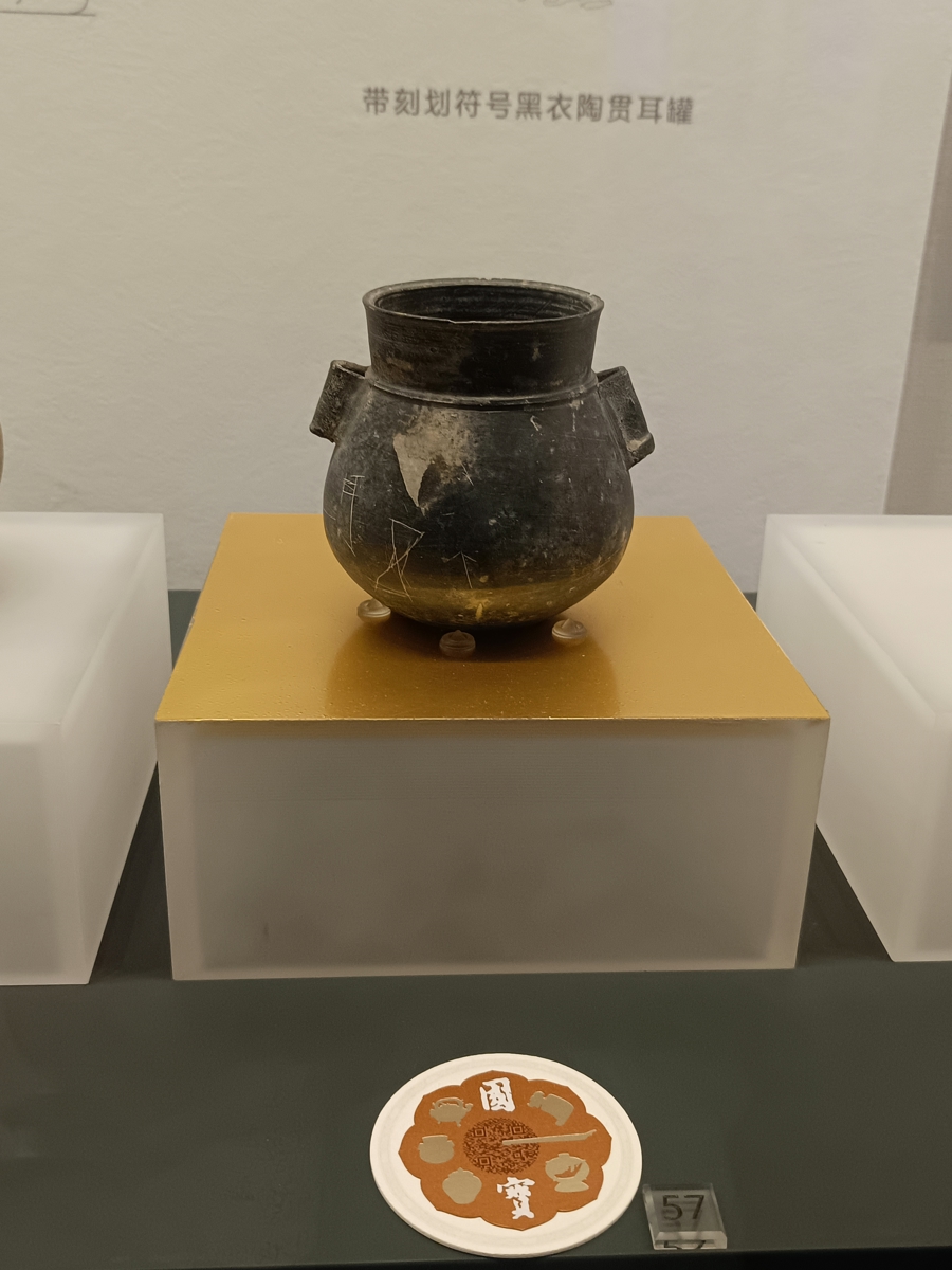 这一黑陶罐的特别之处在于,其上有四个锋利刃器刻划的符号。在良渚文化时期,全国出土的陶罐有几百个,上面有花纹并不稀奇,但这个黑陶罐上刻划的,不仅是造字的基本元素,最重要的是这些符号是有语义的,甚至可以读出来。这是同一时期出土的其它陶罐上所没有的,曾在学界引发激烈的争论。