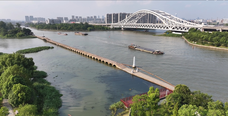 博物馆二楼窗外看出去,千年宝带桥和现代的大桥并列河上。邢千里摄
