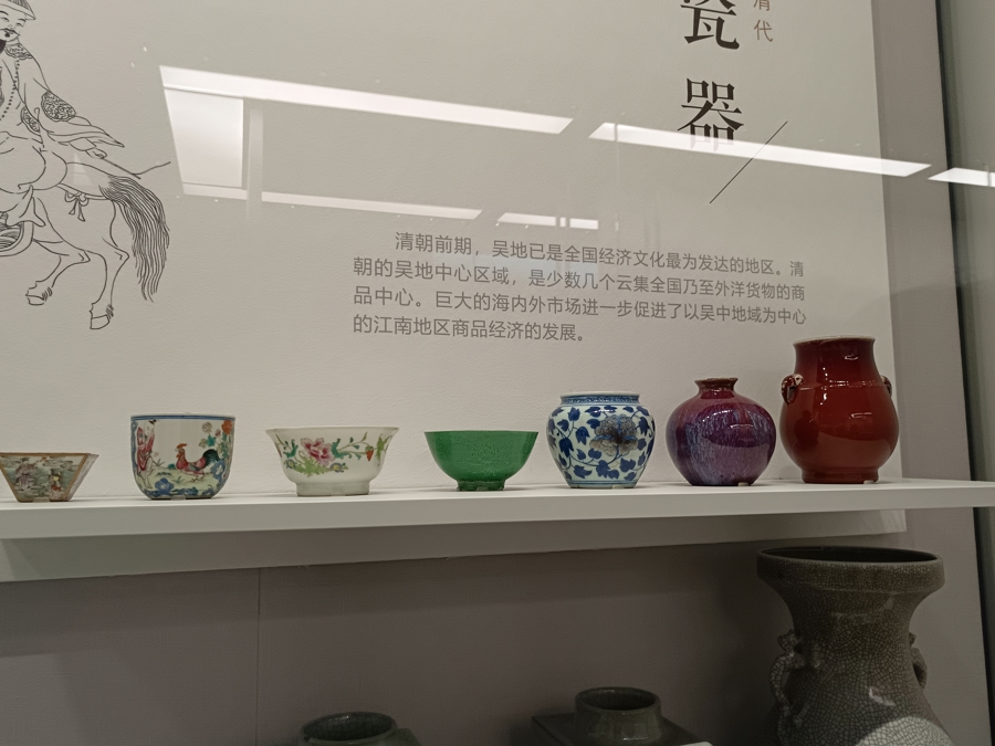 确实,吴文化博物馆的展陈和其它很多博物馆都不一样,大多数博物馆里的展陈,讲述的往往是某个王朝的历史,或恢弘或庄重,但这里的文物几乎件件透着精致,透着烟火气,即便是魏晋南北朝时那些毫无看似普通、毫无雕琢的茶杯等器具,放在今天的人家用,也并不过时,甚至别有风味。